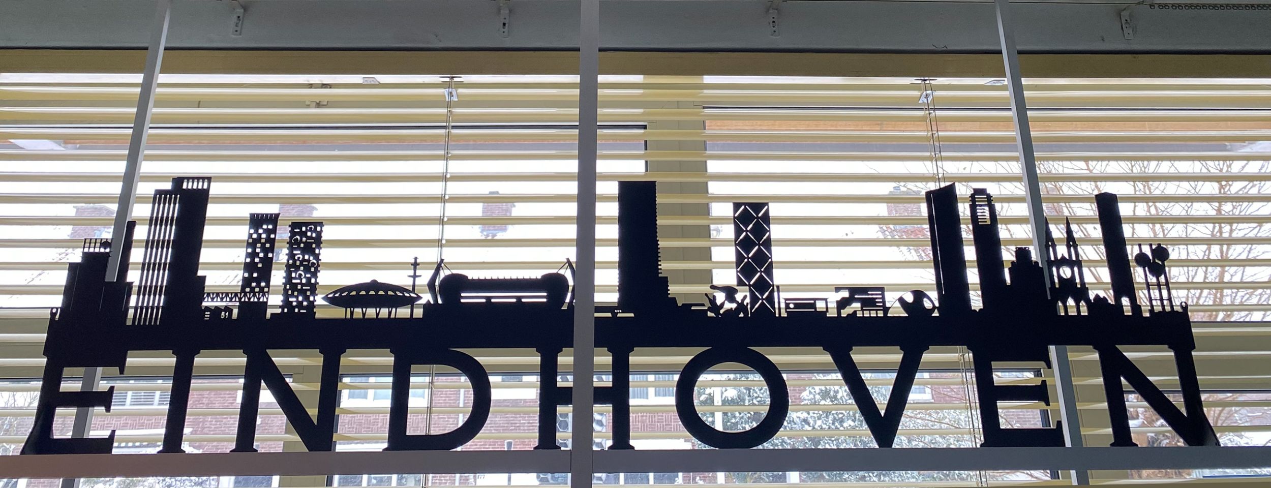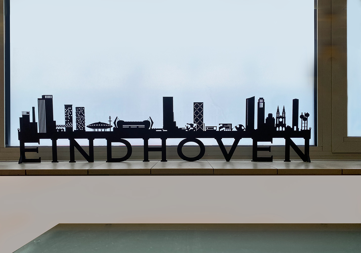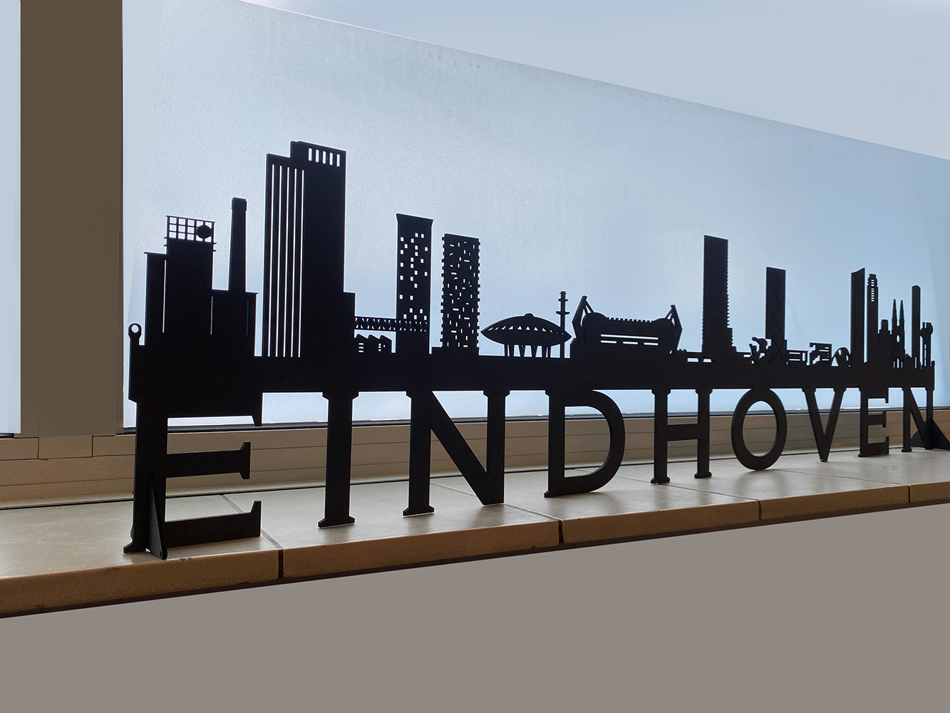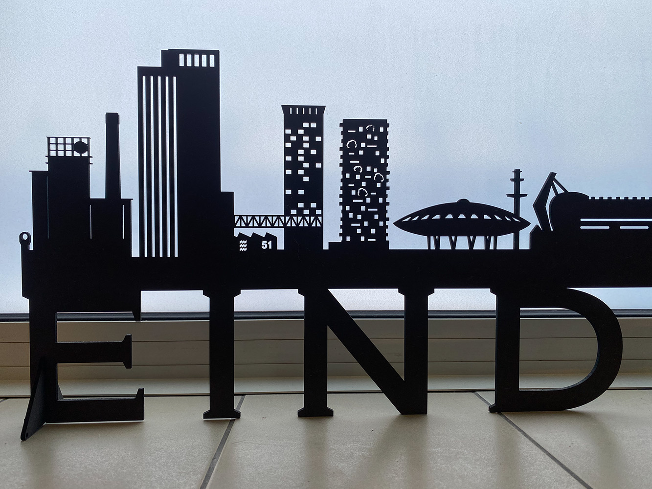 Nieuwe versie. Fraai gedetailleerd aanzicht van de stad Eindhoven, gelaserd uit 3 mm zwart MDF. Mooie combinatie met letters en lettertype. Zowel vlak aan de muur te hangen als neer te zetten. Nieuwste editie met van links naar rechts: Klokgebouw, Lighthouse, Haasje Over, Area 51, Trudo Toren, Evoluon, Philips Stadion, Bunkertoren, Flying Pins, Kennedytoren, Station, Effenaar, Blob, Admirant, Regent, Lichttoren, Catharinakerk, Vesgtedatoren en Waterbollen