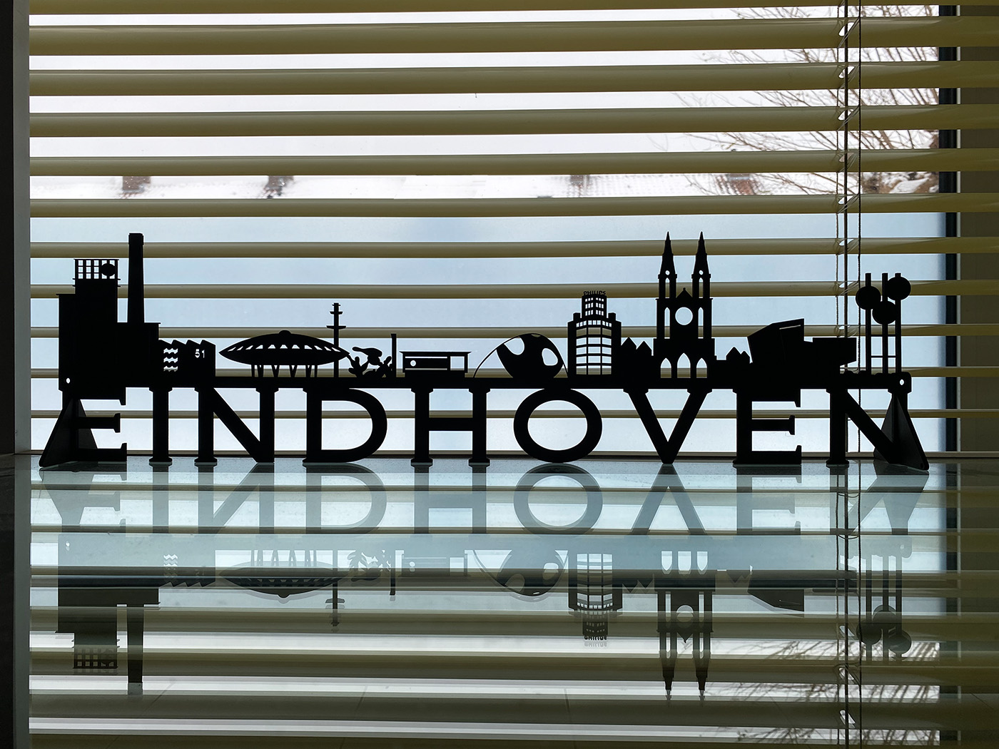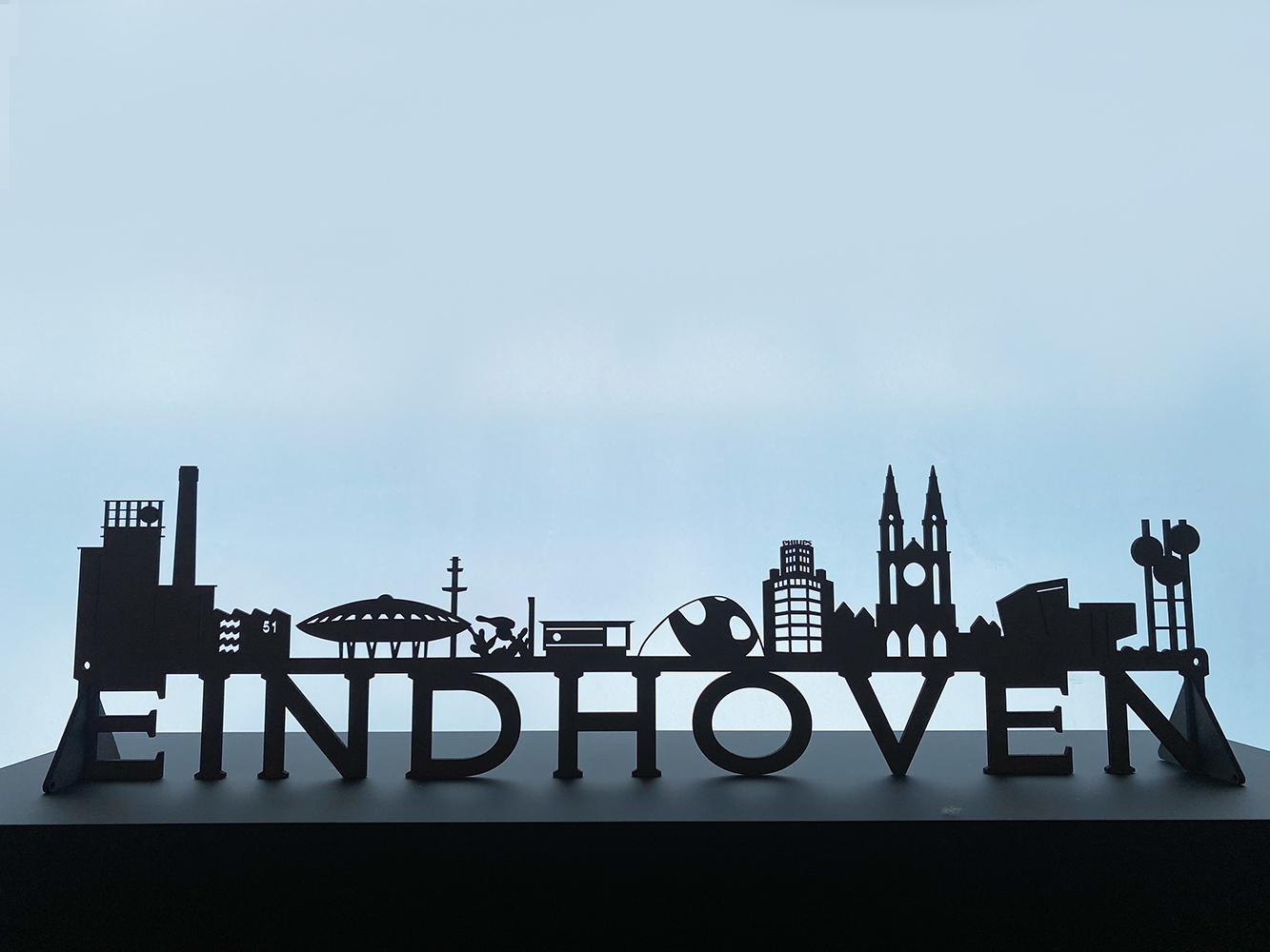 Nieuwe kleine versie .. Fraai gedetailleerd aanzicht van de stad Eindhoven, gelaserd uit 3 mm zwart MDF. Mooie combinatie met letters en lettertype. Zowel vlak aan de muur te hangen als neer te zetten. Aangevuld met centraal station, waterbollen, en meer opengewerkte details. De grotere versie van 120 x 27 cm biedt ook ruimte aan het lighthouse, haasje over, studentenhotel, en de bunkertoren.